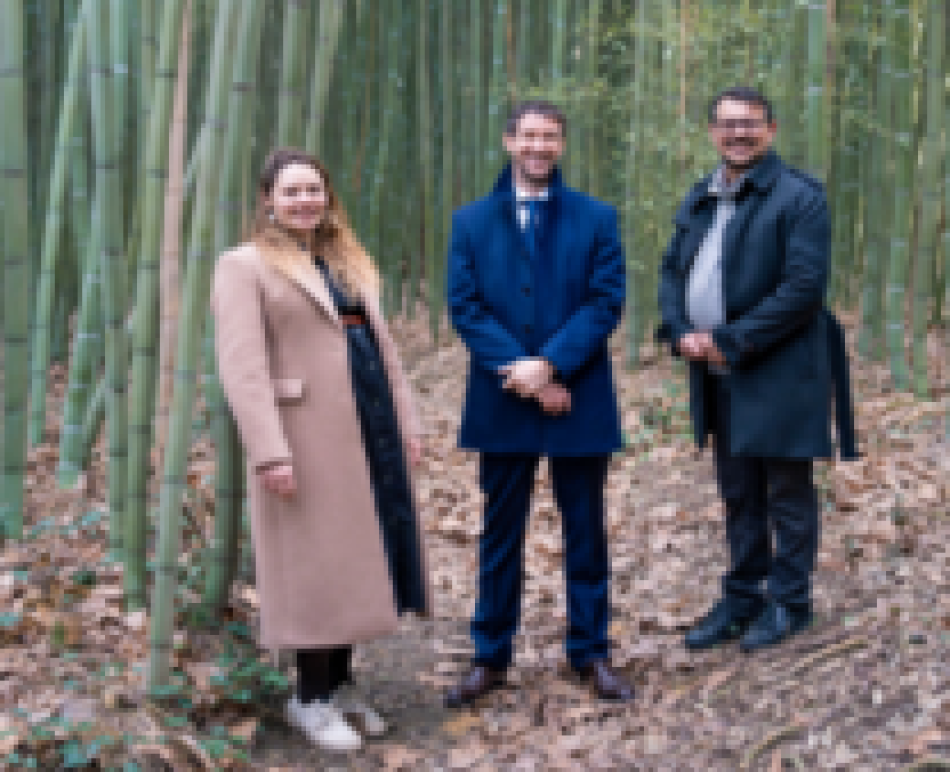 Légende photo (de gauche à droite) : Léa le Poder, PhD Recherche et Développement de Bamboo For Life, Josselin Quignon, Directeur Innovation du Groupe NGE, et Bernard Benayoun, Président de Bamboo For