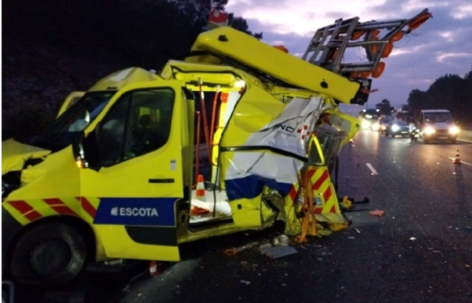 Tous les dispositifs de signalisation lumineuse étaient pourtant activés au moment où un poids lourd est venu le percuter violemment par l’arrière. Aucun homme en jaune n’était présent à l’intérieur du fourgon au moment du choc.