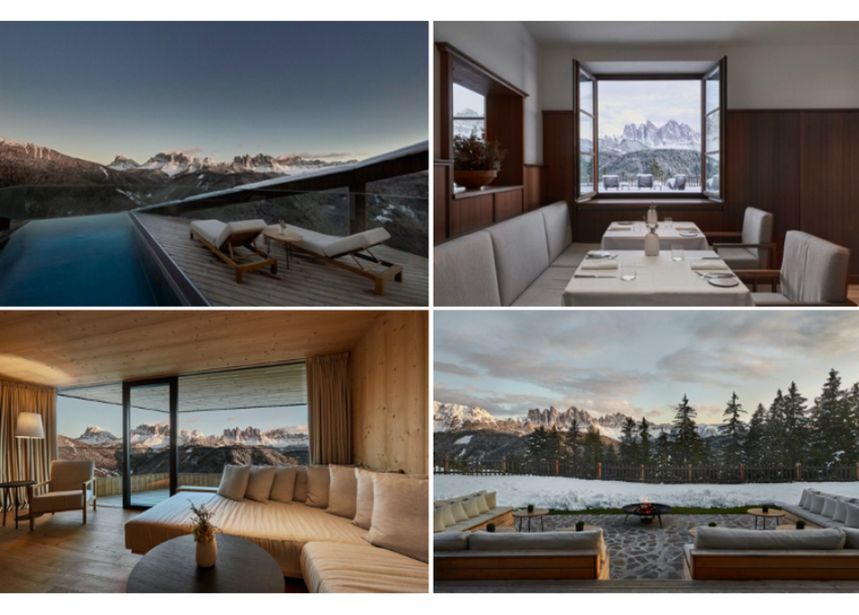 Forêts et sommets enneigés s’étendent dans toutes les directions depuis l’hôtel FORESTIS, un sanctuaire perché au sommet, dans un endroit abrité et ensoleillé des Dolomites.