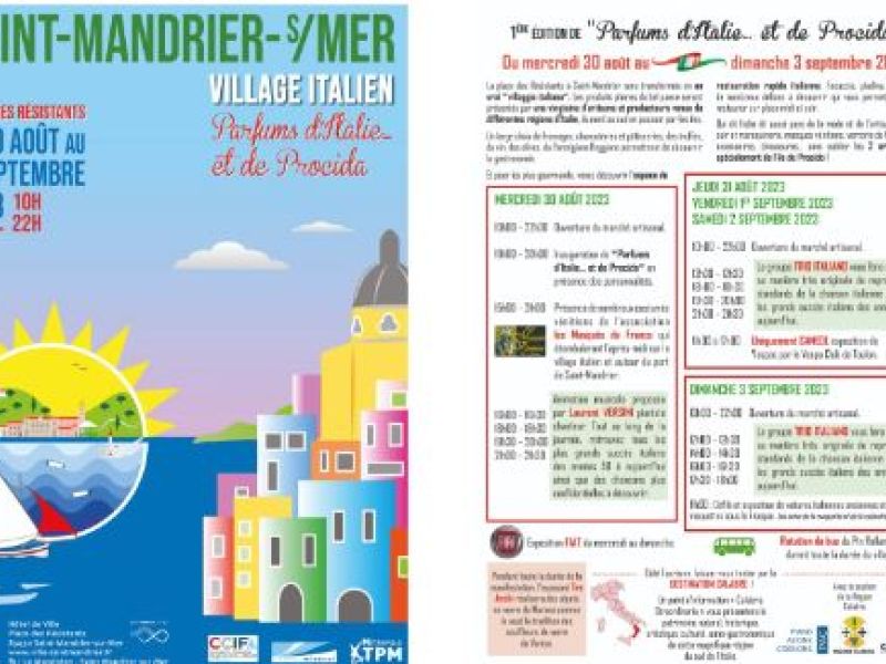 La ville de Saint-Mandrier-sur-Mer organise, en partenariat avec la Chambre de Commerce Italienne pour la France de Marseille (CCIFM), son premier Village Italien, « Parfums d’Italie… et de Procida », du mercredi 30 août au dimanche 3 septembre sur la place des Résistants.