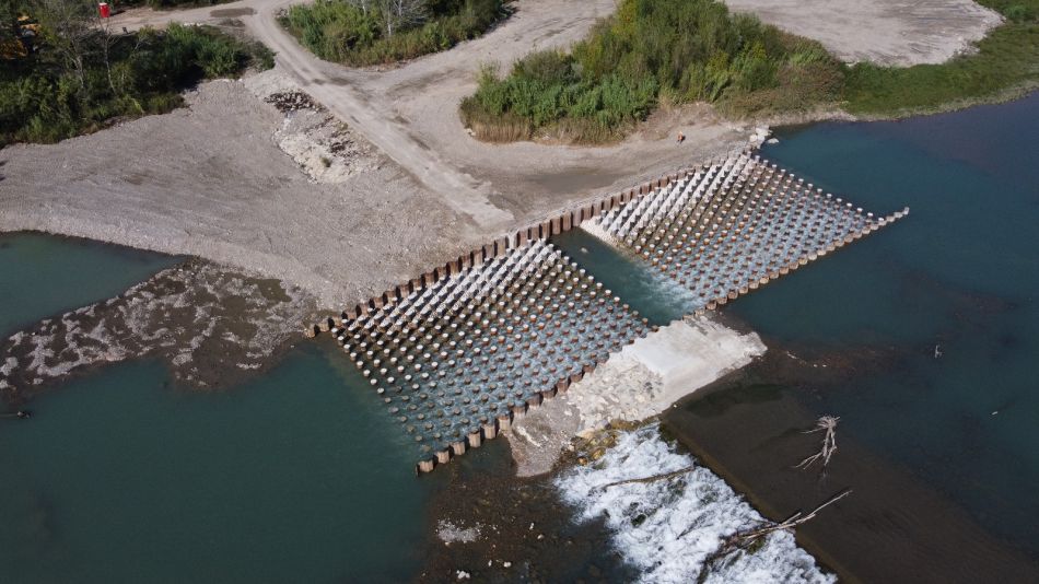 Le cahier des charges prévoyait la réalisation des travaux pendant 8 semaines entre juillet et septembre des années 2024 et 2025. Les équipes de Spie batignolles travaux publics ont démarré les travaux en 2024 par de lourds travaux de terrassement visant à abaisser les seuils 67 et 68. Ces travaux ont été réalisés directement dans le lit de la rivière, à l’aval du barrage de Bonpas dans le respect de tous les enjeux environnementaux (reproduction des espèces …). Les équipes ont abattu les couches liaisonnées avant de les isoler en vue d’être réemployées, retiré et trié les enrochements (près de 15 000 m3). S’en est suivie une importante phase de terrassement en grande masse, représentant 70 000 m3 de matériaux excavés, au moyen d’outils spécifiques adaptés à des travaux aquatiques. Sur les seuils 67 et 68, les équipes travaux ont créé une échancrure d’1 mètre de profondeur pour le premier sur 180 ml et une échancrure de 2 mètres de profondeur pour le second sur 300 ml. Trois rampes à macro-rugosités, dont deux passes à poisson en béton, ont été installées au niveau de ces deux seuils. Sur le seuil 68, la pose de la rampe a été complétée par la création d’un radier de confortement du seuil, de reprises sur le coursier et sur la crête. Ces rampes se présentent sous la forme d’une échelle offrant aux poissons différents paliers d’accès pour leur permettre de poursuivre leur chemin dans la rivière. Leur construction a nécessité l’installation de près de 441 tonnes de palplanches métalliques, l’emploi de 2 200 m3 de béton.