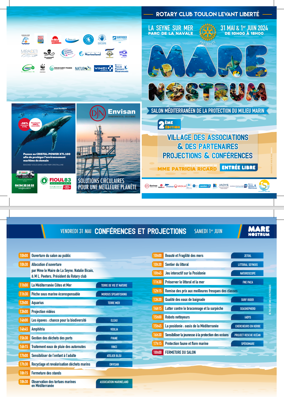 Les vendredi 31 mai et samedi 1er juin, le Rotary Toulon Levant Liberté organise, sur le parc de la Navale avec le soutien de la Ville, la deuxième édition de « Mare Nostrum », salon méditerranéen de la protection marine. Nathalie Bicais, Maire de La Seyne, et Patricia Ricard, présidente de l’Institut océanographique Paul-Ricard et marraine de l’événement, participent au lancement du salon vendredi 31 mai à 11h00, parc de la Navale.