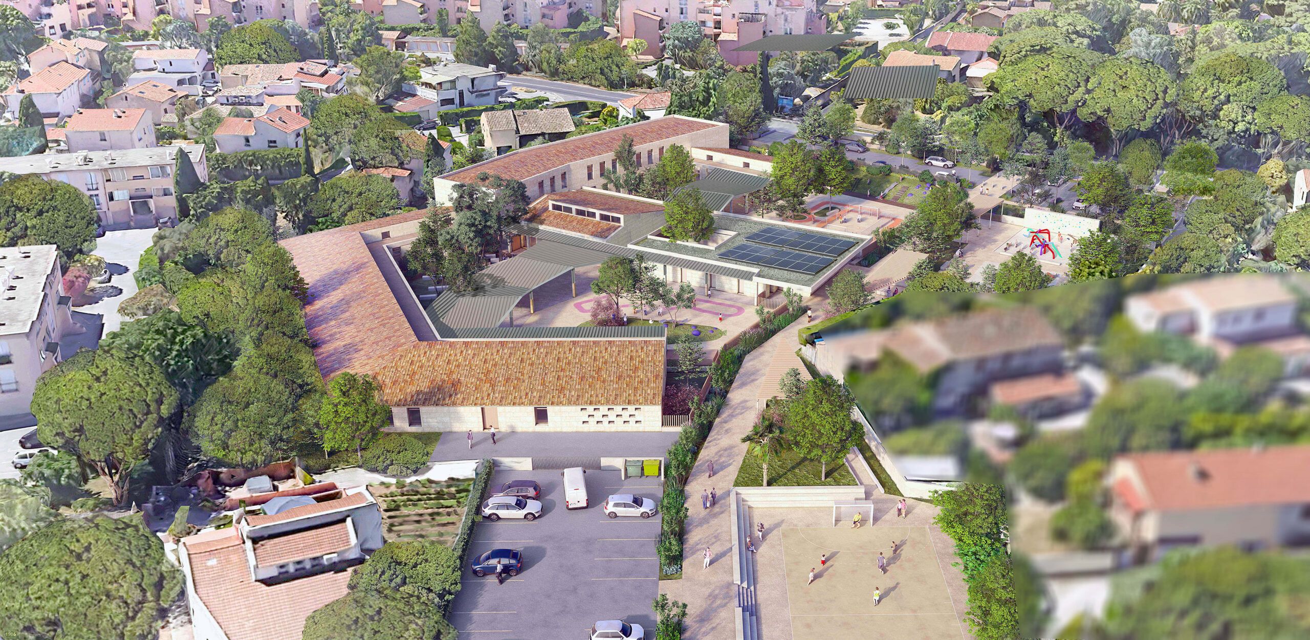 La Municipalité a été très exigeante au niveau du volet environnemental du projet. Le futur bâtiment sera classé Bâtiment Durable Méditerranéen, niveau argent. L’attention s’est portée sur la qualité paysagère et architecturale du projet avec une forte présence de la végétation dans et aux abords des écoles et le recours à des matériaux nobles et biosourcés et une esthétique sobre respectant l’esprit méditerranéen, s’intégrant dans le quartier ».