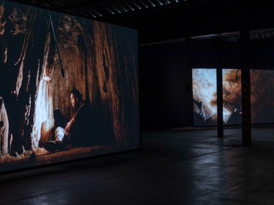 Dans une obscurité presque totale, Oliver Beer nous plonge dans une atmosphère sonore unique, où les voix de chanteurs résonnent dans des grottes paléolithiques. Cette polyphonie envoûtante, combinée aux vibrations des pigments qui dansent sur des toiles, transporte le spectateur dans un espace méditatif entre passé et présent.