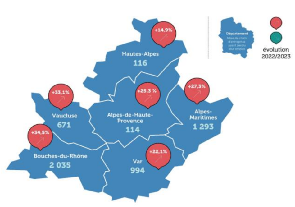5 223 chefs d’entreprise ont perdu leur emploi en Région Sud en 2023, c’est 1 184 femmes et hommes de plus qu’en 2022, soit 29,3 % sur un an, selon l’Observatoire de l’emploi des entrepreneurs de l’association GSC et du groupe Altares. Le nombre de pertes d’emploi dépasse les seuils d’avant-crise Covid et atteint son plus haut niveau depuis la crise financière de 2016.