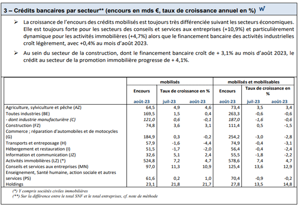 Au sein du secteur de la construction, dont le financement bancaire croît de + 3,1% au mois d’août 2023, le crédit au secteur de la promotion immobilière progresse de + 4,1%.