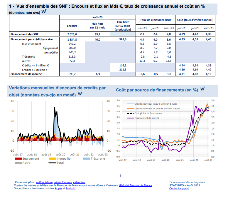 - La croissance des financements accordés aux sociétés non financières (SNF) continue à se modérer en août (+2,0%, après +2,4% en juillet) sous l’effet du ralentissement gradué du crédit bancaire (+3,6% après +4,0%) et de la poursuite de la réduction de l’encours de titres de dette (-1,0% après -0,5%).