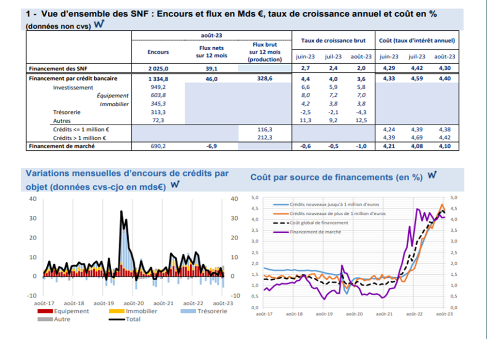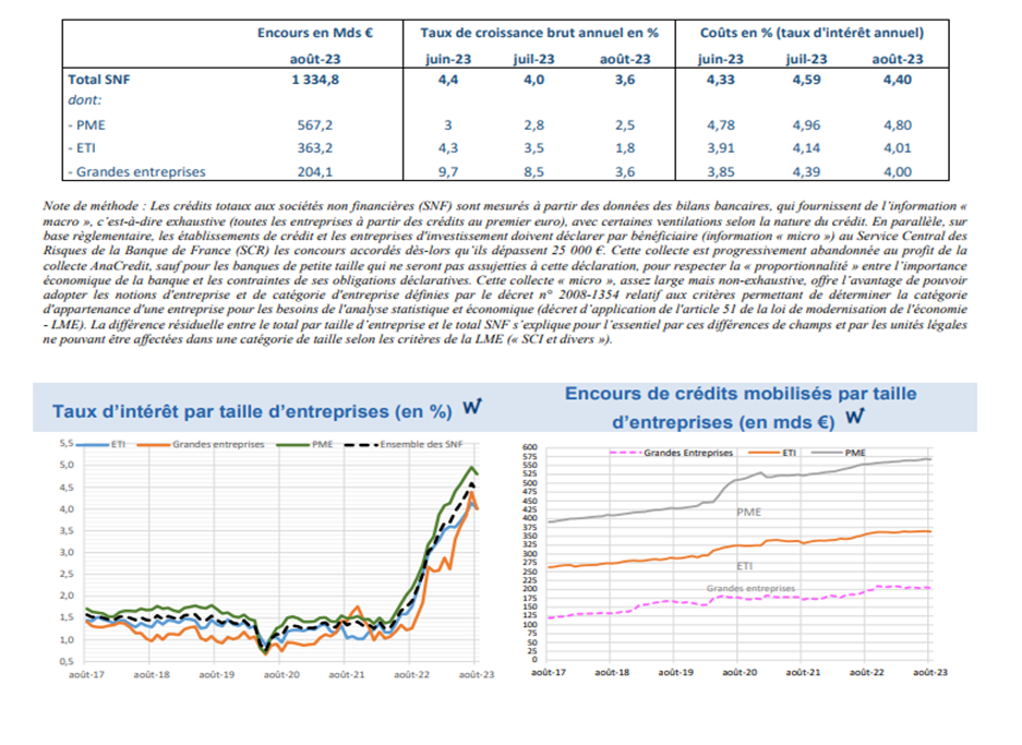 Le coût du crédit diminue un peu pour toutes les tailles d’entreprises, s’établissant en août 2023 à un taux d’intérêt annuel de 4,80% pour les PME, 4,01% pour les ETI et 4,00% pour les grandes entreprises.