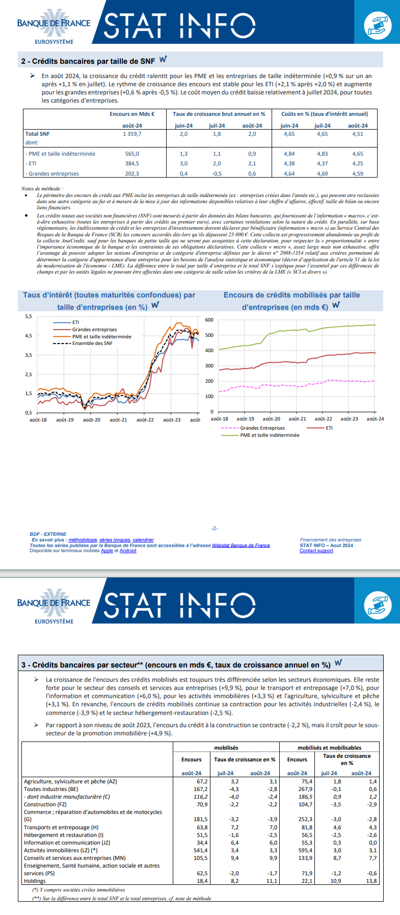 En août 2024, les financements accordés aux sociétés non financières (SNF) progressent de +2,3 % en rythme annuel (après +2,2 % en juillet et +2,6 % en juin) sous l’effet conjugué de la hausse des encours de crédits bancaires (+2,0 % après +1,8 % en juillet) et de titres de dette (+3,0 %, inchangé par rapport à juillet).