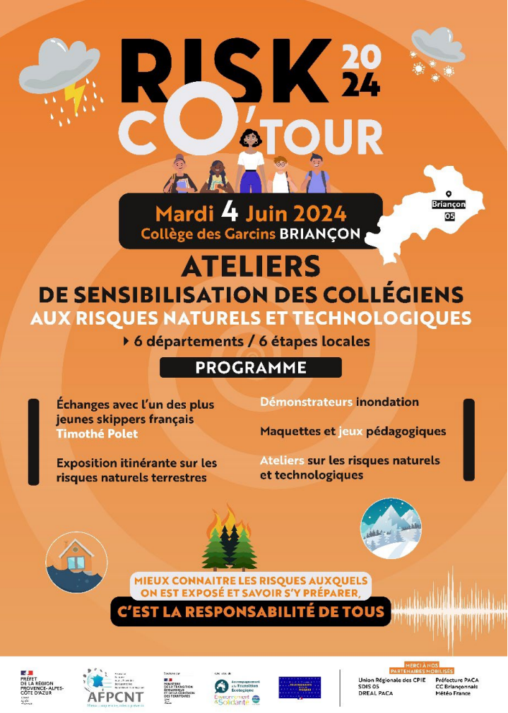 La DREAL PACA, l’AFPCNT (Association pour la Prévention des Catastrophes Naturelles et Technologies) et le réseau régional des CPIE PACA organisent pour la deuxième année consécutive le RISK’CO TOUR : tour de sensibilisation des jeunes de la région PACA aux risques majeurs de juin à novembre 2024. Cette manifestation régionale s’inscrit dans l’esprit de la Journée Nationale de la Résilience, le 13 octobre.