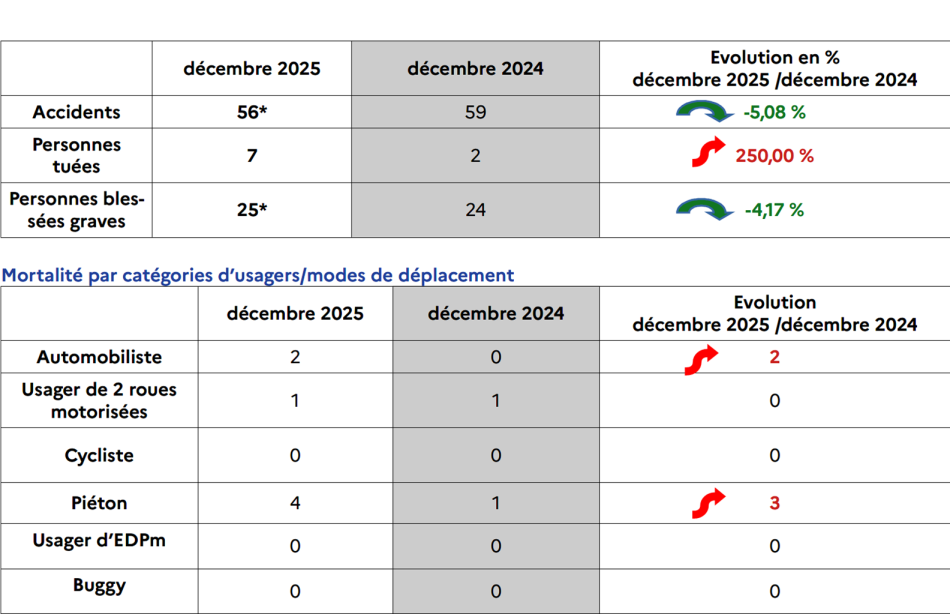 D’après les données provisoires de l’observatoire départemental de la sécurité routière (ODSR), la mortalité routière du mois de décembre 2025 est en forte hausse par rapport à décembre 2024.