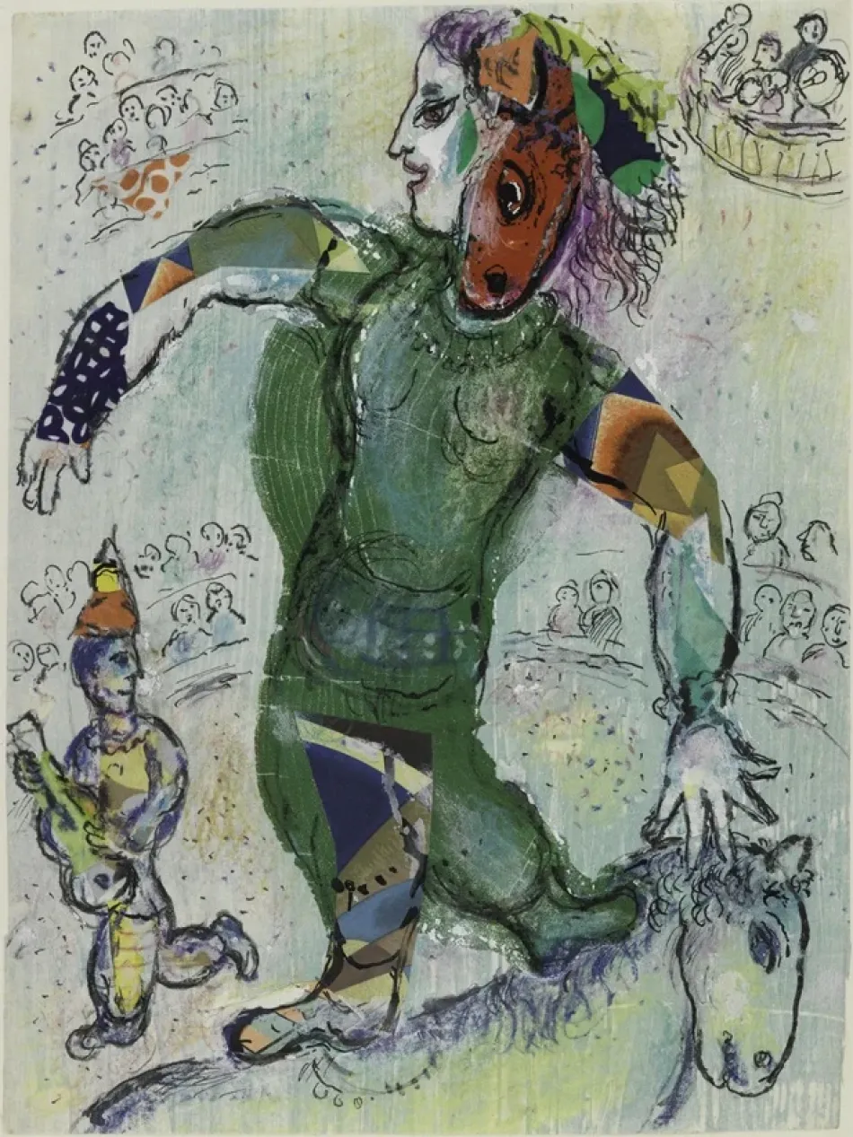 L’exposition met également en lumière le rapport charnel que Chagall entretenait avec le spectacle vivant. Un deuxième volet du parcours rassemble soixante-quatre esquisses de rideaux de scène et de costumes réalisés pour le ballet *L’Oiseau de feu*.