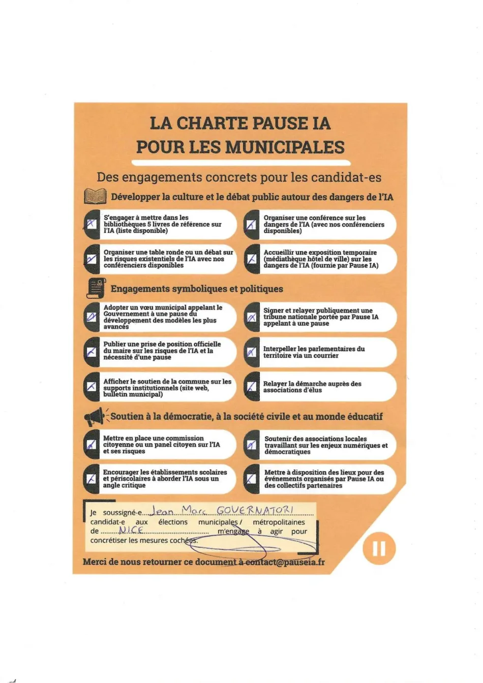 Pour l’association Pause IA (https://pauseia.fr/), l’échelon local est stratégique pour porter ce débat de société. « Pause IA remercie et félicite Jean Marc Governatori pour ces engagements sur le sujet urgent du développement de l’intelligence artificielle. Notre association encourage l’ensemble des candidats de Nice à se positionner clairement. Les collectivités peuvent jouer un rôle concret pour informer et porter la demande d’une pause du développement des modèles les plus avancés d’IA », a déclaré Maxime Fournes, cofondateur de Pause IA.