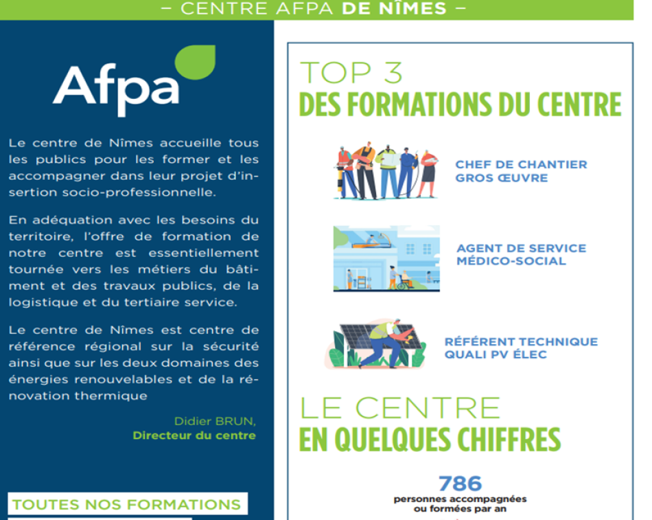 « Un actif sur huit en France a bénéficié ou bénéficiera dans sa vie professionnelle de l’accompagnement ou de la formation de l’Afpa, affirmant ainsi notre rôle d’opérateur de référence en matière d’inclusion et de promotion sociale par la qualification et l’emploi. Avec plus de 100 formations disponibles en présentiel et en distanciel, l’Afpa Occitanie est un organisme multi-métiers qui privilégie la mise en situation professionnelle, où 100% de l’activité du stagiaire est centrée sur l’exercice du métier. Nos 250 formateurs, tous experts avec au moins cinq ans d’expérience, assurent une formation de qualité. De plus, nous sommes leaders dans les secteurs qui recrutent massivement ».