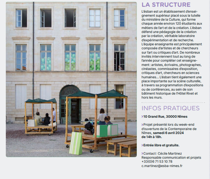 Andréanne Béguin a bénéficié du programme L’Avancée, en collaboration avec la filière « artistes et métiers de l’exposition » des Beaux-Arts de Paris, à la Fondation Pernod Ricard en 2022-2023. Autres participations des étudiants de l’ésban à la Contemporaine de Nîmes : Les étudiantes et étudiants de l’ésban sont également impliqués dans plusieurs projets en lien avec la triennale : réalisation de podcasts sur plusieurs artistes de l’exposition diffusés lors du festival et sur la radio RayVox ; collaboration avec Suzanne Husky et Green Resistance pour le projet de l’exposition à la Chapelle des Jésuites ; collaboration avec Alassan Diawara pour son projet de l’exposition à Carré d’Art – Musée d’art contemporain ; participation à la création de Dimitri Chamblas dans les temps forts ; partenariat avec le Festival Delco pour le concert de Thomas Tilly et Jean-Luc Guionnet figurant dans la programmation associée.
