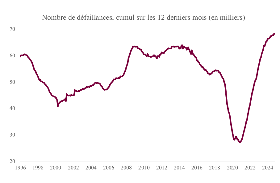– Après une chute historique des défaillances observée pendant la crise sanitaire grâce aux aides de l’Etat, le nombre de défaillances est reparti à la hausse. En cumulé depuis le mois de janvier, le nombre de défaillances est de 56 178 contre 54 428 pour la période janvier – octobre 2024.