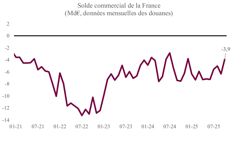 De plus, la tendance de fond révèle une légère dégradation : en tendance (moyenne mobile sur 3 mois), la balance commerciale se détériore de 0,1 Md€, en raison d’une baisse des exportations sur la période alors que les importations se stabilisent.