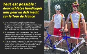 Axel Allétru (LILLE – paraplégique) et Aurélien Vauquelin (COMPIÈGNE – malvoyant) feront en avant-course la dernière étape du Tour de France 2024 entre Monaco et Nice, le 21 juillet, sur un vélo tandem électrique.