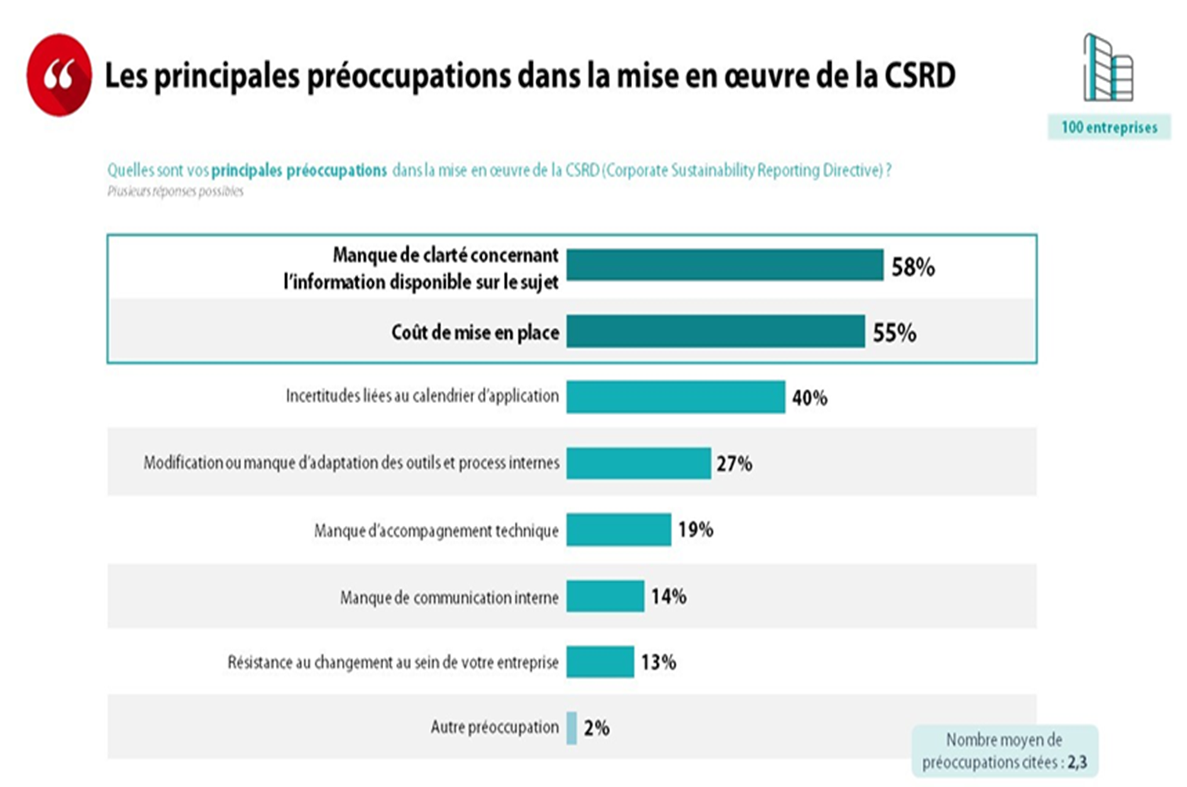 Le déploiement de la CSDR s’accompagne de deux principales préoccupations en moyenne citées par les dirigeants : les inquiétudes liées au manque de clarté des informations disponibles (58 %) et le coût financier de la mise en place du projet (55 %) et, dans une moindre mesure (40%), des incertitudes sur le calendrier d’application.