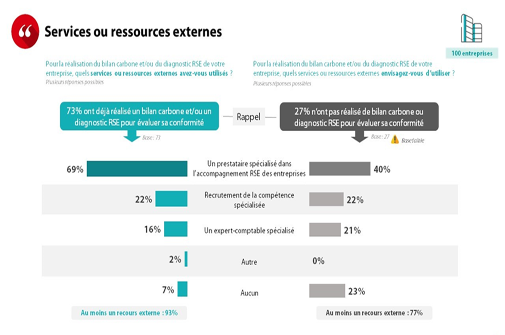 73 % des ETI ont déjà réalisé un bilan carbone ou un diagnostic RSE pour évaluer leur conformité par rapport aux attentes des parties prenantes. 36% ont même effectué les deux. Des bilans/diagnostics qui se font ou se feront principalement avec un prestataire spécialisé.