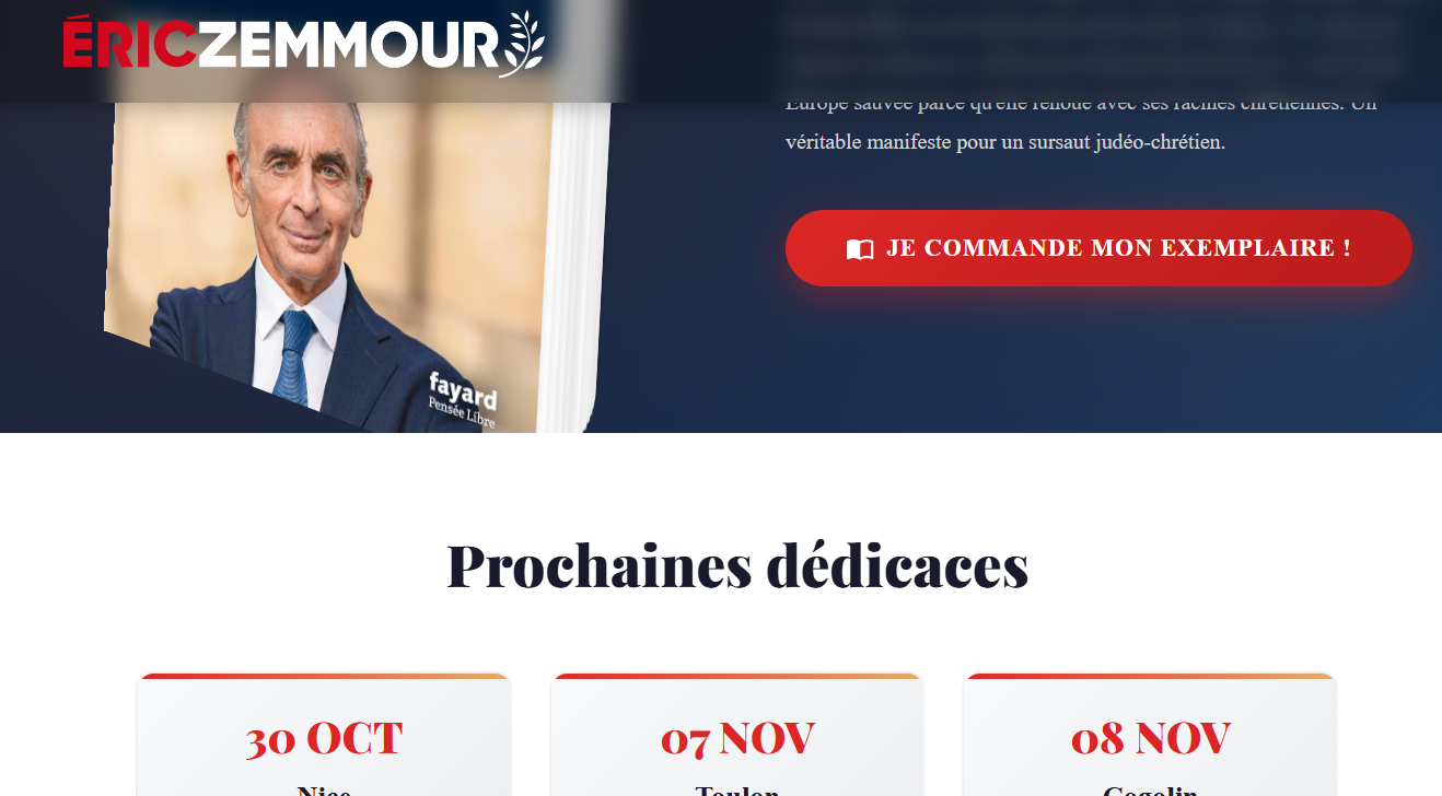 « Vous pouvez également voir les prochaines dates sur le site dédié. Il sera mis à jour régulièrement, avec les lieux et dates de mes dédicaces ». Éric Zemmour.