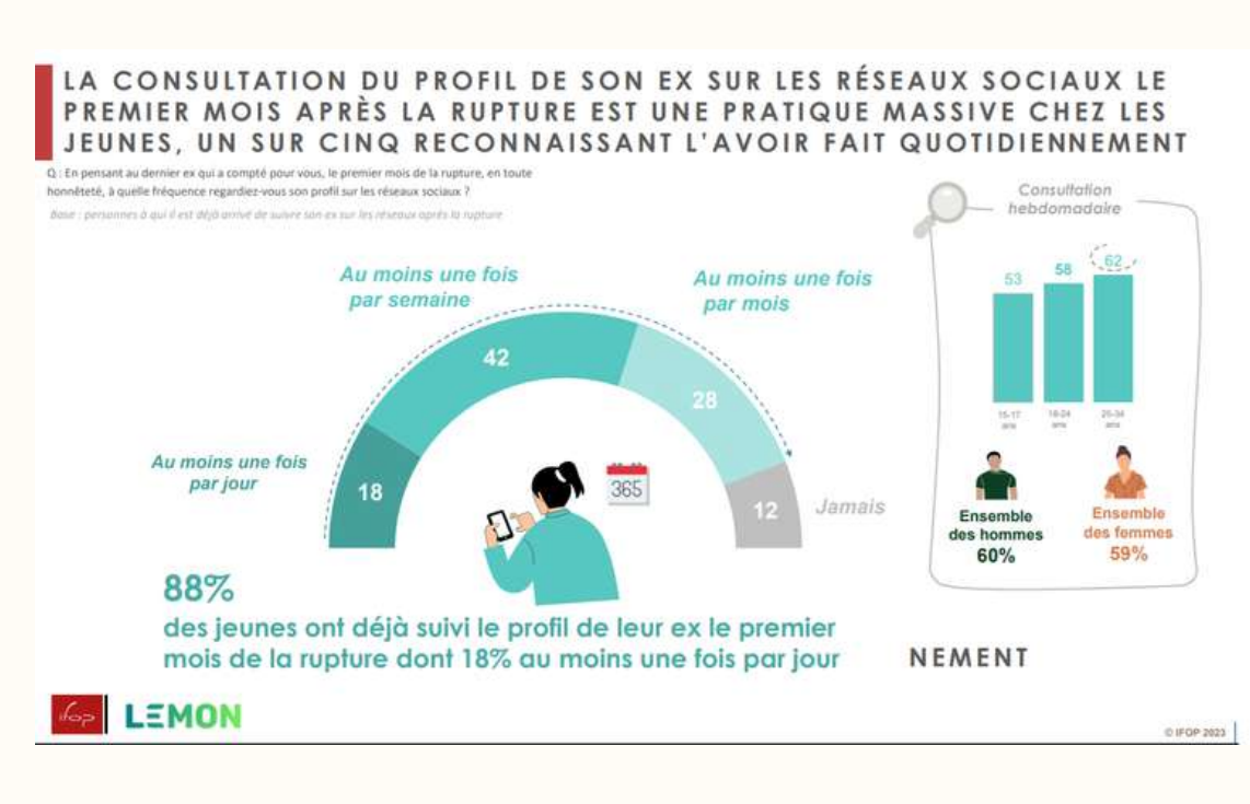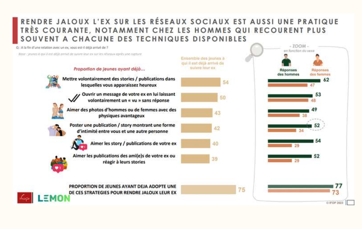 - 75% utilisent au moins une technique en ligne pour provoquer la jalousie leur ex ;