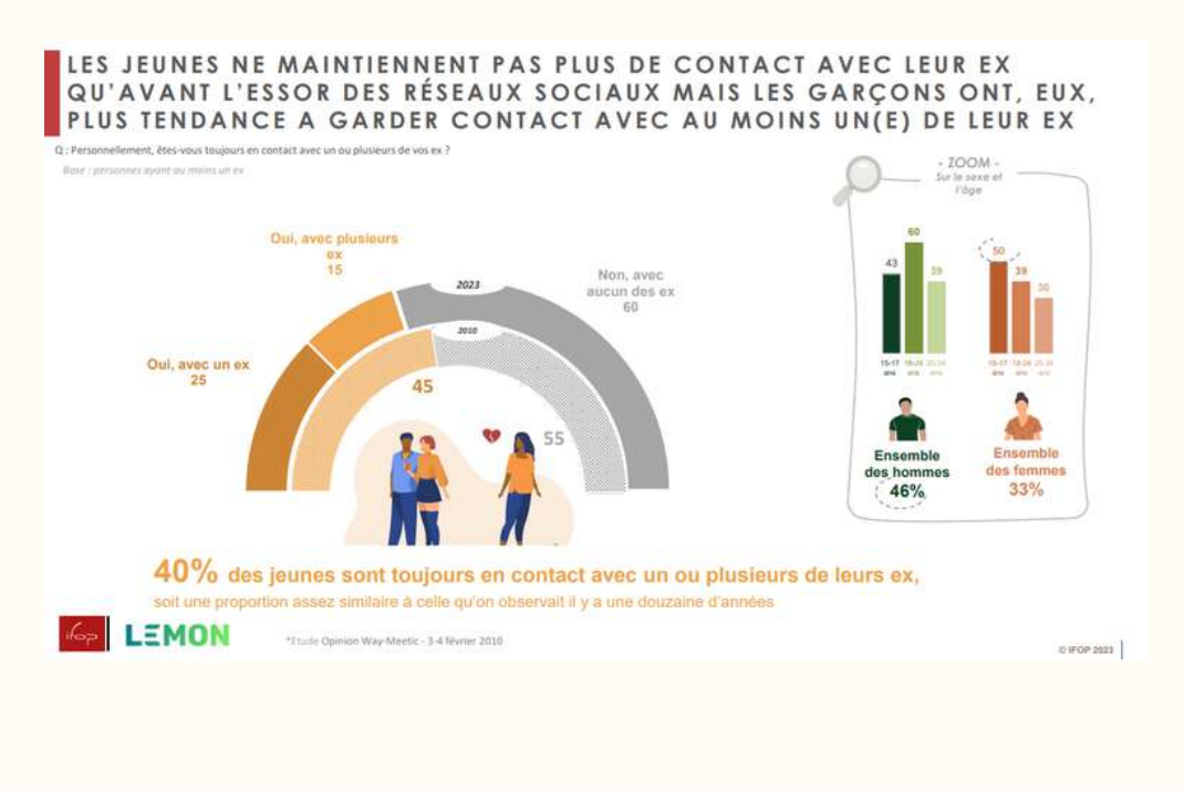 - 64% des Français de moins de 35 ans jugent possible de rester amis avec un ou une ex, mais seuls 29% pensent que cela peut exister sans ambiguïté ;