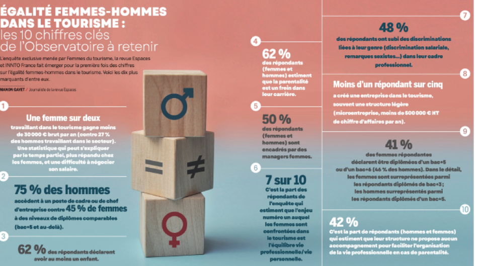 À l’occasion de ses 20 ans, l’association Femmes du Tourisme publie le premier Observatoire de l’égalité Femmes – Hommes dans l’industrie du tourisme, mené avec la revue Espaces et INNTO France*. Une enquête inédite, réalisée auprès de 1916 professionnels et 286 étudiants, dont 84 % de femmes — preuve d’une forte attente du secteur pour cette démarche. Les résultats livrent un constat sans appel : alors que les femmes représentent la majorité des forces vives du tourisme, les inégalités restent massives, systémiques et durablement ancrées.