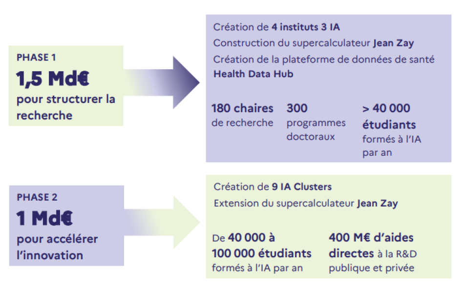 La première phase de la Stratégie nationale de l’IA (2018-2022), dotée de 1,5 Md€, a permis de structurer un solide écosystème de recherche. Depuis 2022, la deuxième phase, soutenue par 1 Md€ via le plan d’investissement France 2030, vise à faire de cette technologie un levier de transformation pour nos processus de production et d’innovation.