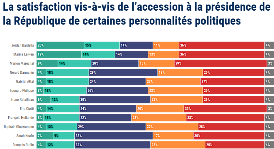 Dans la perspective de l’élection présidentielle de 2027, Jordan Bardella reste en tête des personnalités dont l’accession à la présidence de la République susciterait le plus de satisfaction (35%, +2 points). Le président du RN arrive juste devant Marine Le Pen (33%, +3 points). Marion Maréchal complète le podium (23%, +5 points), devant Gérald Darmanin (22%, +4 points) et Gabriel Attal (22%, +3 points). Edouard Philippe suit de près avec 21% (+3 points)
