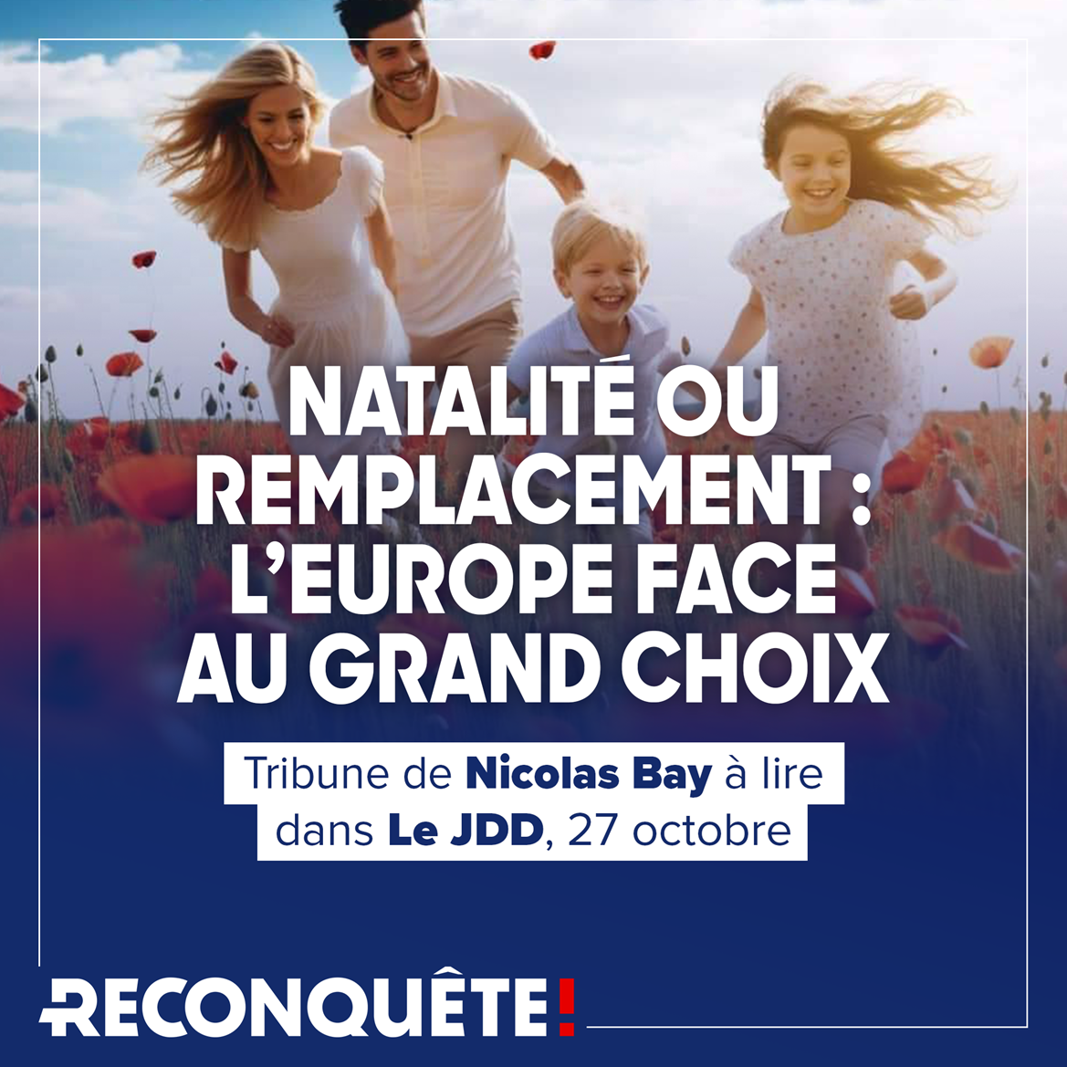 « Face à cette menace mortelle de disparition de nos peuples et de notre civilisation, une ambition nataliste des nations européennes constitue une urgence vitale » a déclaré Nicolas Bay pour Reconquête