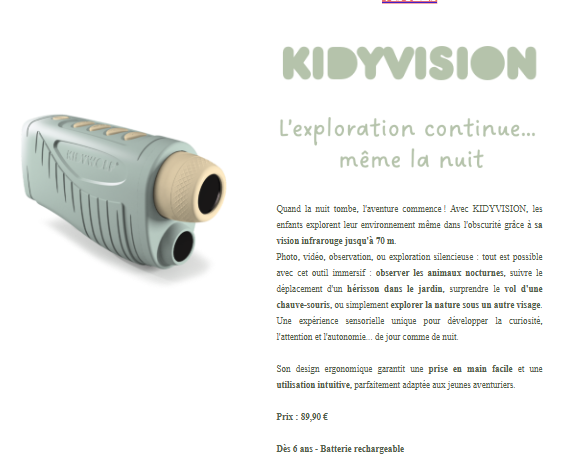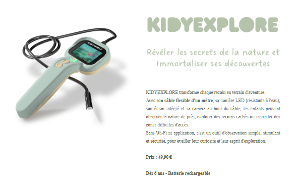 Pensés pour les jeunes explorateurs: KIDYEXPLORE, KIDYSPY, KIDYVISION et KIDYTALK offrent chacun une approche ludique et éducative de l’observation, de la nature à la technologie.