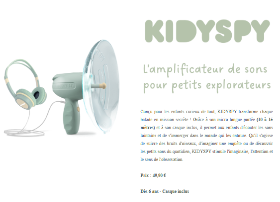 Conçu pour les enfants curieux de tout, KIDYSPY transforme chaque balade en mission secrète ! Grâce à son micro longue portée (10 à 15 mètres) et à son casque inclus, il permet aux enfants d’écouter les sons lointains et de s’immerger dans le monde qui les entoure. Qu’il s’agisse de suivre des bruits d’oiseaux, d’imaginer une enquête ou de découvrir les petits sons du quotidien, KIDYSPY stimule l’imaginaire, l’attention et le sens de l’observation.