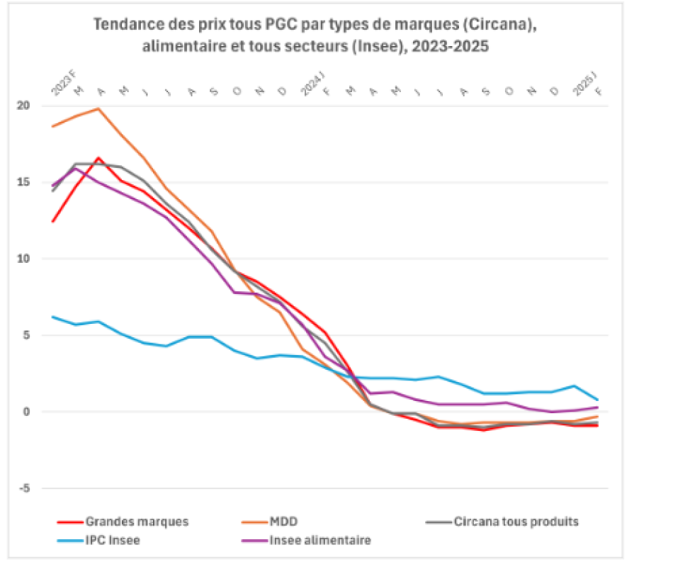 À un an d’intervalle, les prix des PGC enregistrent une baisse de 0,7 % : – 1,5 % en drives, – 1 % en hypermarchés, , – 0,6 % en supermarchés, mais + 0,1 % en proximité. Elle est globalement de 0,4 % en alimentaire et de 2,7 % dans le DPH. L’écart entre marques et MDD est de 0,6 point de déflation supplémentaire chez les marques nationales.