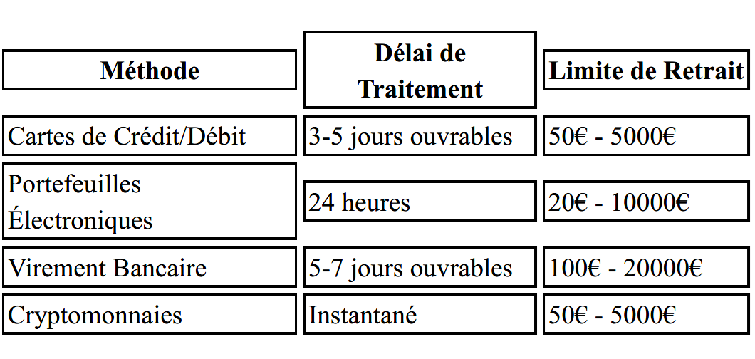 Voici un tableau des délais et limites de retrait selon les méthodes :