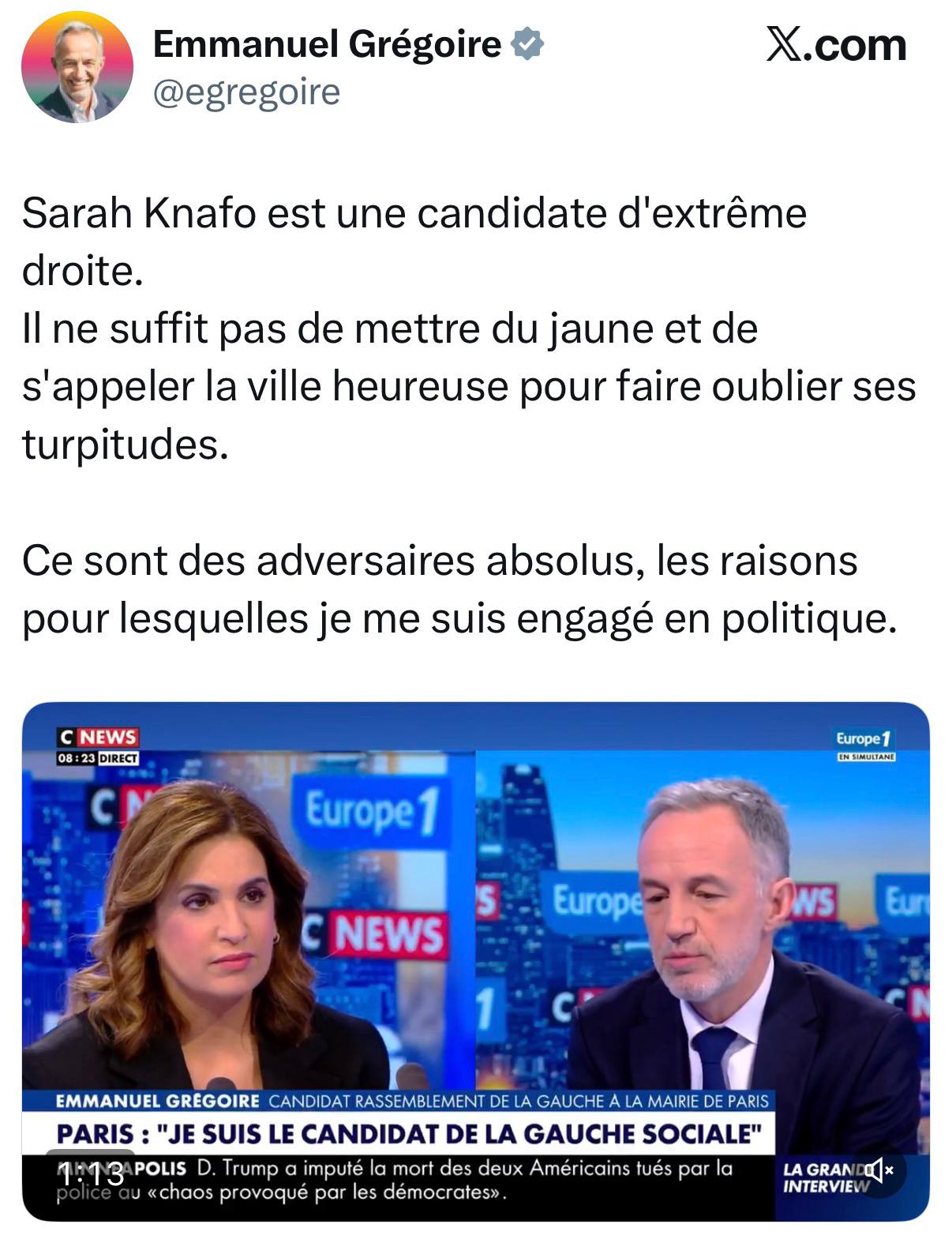 « Sarah Knafo est une candidate d’extrême droite. Il ne suffit pas de mettre du jaune et de s’appeler la ville heureuse pour faire oublier ses turpitudes. Ce sont des adversaires absolus, les raisons pour lesquelles je me suis engagé en politique ». Emmanuel Grégoire, sur X.com.