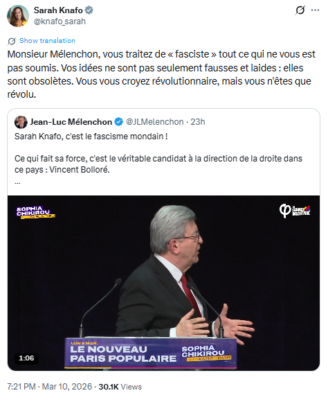 PARIS : Sarah Knafo : « Repostez ma réponse à Mélenchon » !