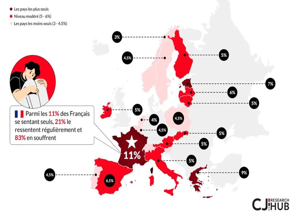 Les données révélées par l’étude sont sans appel et placent la France dans une position particulièrement préoccupante. Le pays détient le taux de solitude le plus élevé d’Europe, avec 11 % de la population déclarant se sentir seule « la plupart du temps » ou « tout le temps ». Cette situation est encore plus critique chez les jeunes : 63 % des Français âgés de 18 à 35 ans souffrent d’une solitude qualifiée de modérée à sévère, un record sur le continent.