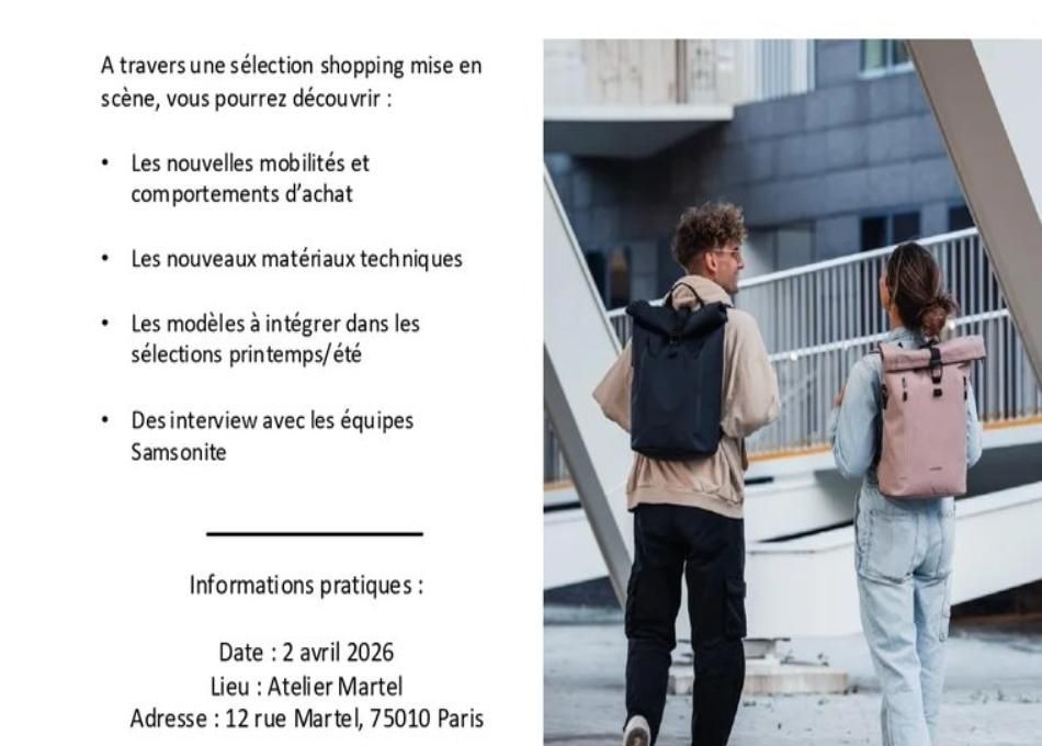 Les modes de vie se transforment, les rythmes de travail s’hybrident et les frontières entre la sphère professionnelle et la vie privée deviennent de plus en plus poreuses. Dans ce contexte de mutation profonde, le sac à dos s’est imposé comme l’accessoire emblématique des mobilités contemporaines, dépassant sa fonction originelle pour devenir un véritable compagnon du quotidien. Conscient de ce phénomène, le leader mondial de la bagagerie Samsonite annonce la tenue d’un showroom immersif dédié à cet objet phare, le jeudi 2 avril 2026 à l’Atelier Martel, dans le 10ème arrondissement de Paris.
