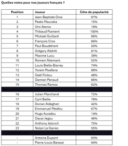 Et malgré le succès dans le tournoi, seulement 3 français intègrent le XV de départ. J’ai aussi inclus la côte de popularité de tous les joueurs français, ci-dessous.
