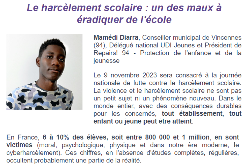 PARIS : UDI – Le harcèlement scolaire
