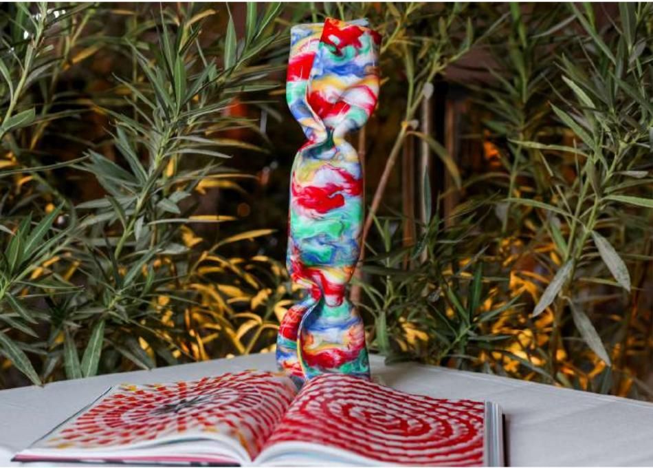 - Wrapping Bonbon Arlequin (44 cm, Plexiglas, 2025) : Explosion de couleurs vives qui évoque la joie de vivre et l’esprit festif caractéristique de l’ambiance du restaurant.