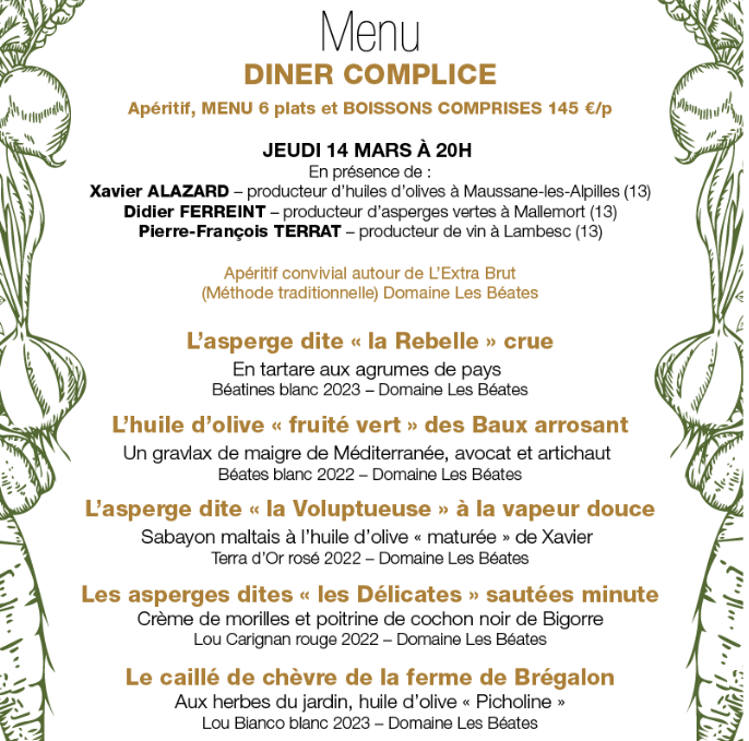 Nicolas Bottero et ses équipes rassembleront, ce jeudi 14 mars au dîner, 3 de leurs plus proches producteurs des Bouches du Rhône afin d’offrir une soirée en accord mets et vins autour des pépites de :