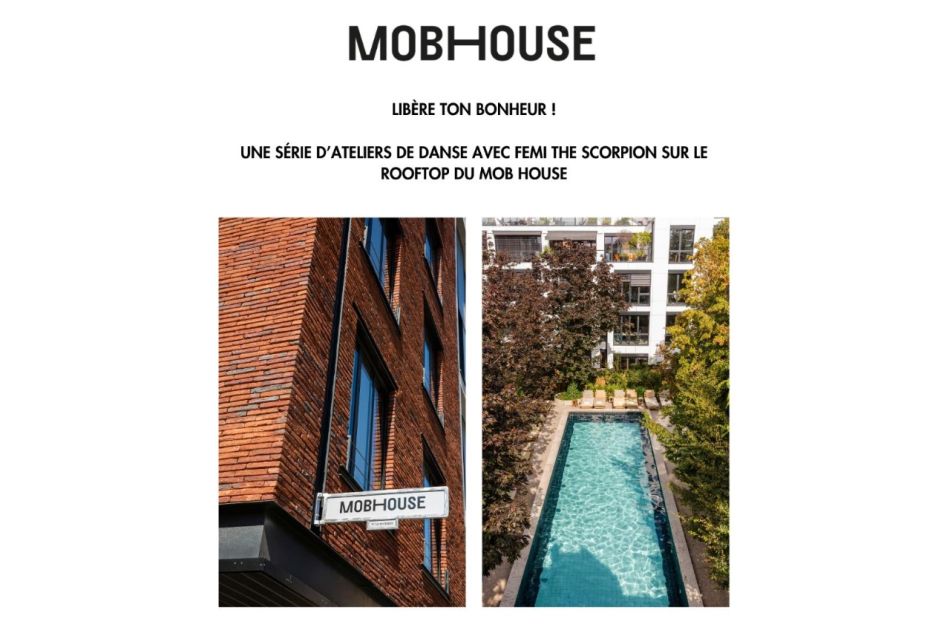 Ces ateliers se dérouleront sur le rooftop du MOB HOUSE, offrant une vue dégagée sur le ciel parisien. Chaque session sera une expérience sensorielle unique, mêlant lâcher-prise et énergie de groupe. Femi The Scorpion, connu pour sa grammaire chorégraphique intuitive et libératrice, guidera les participants à travers des rituels chorégraphiques au coucher du soleil.