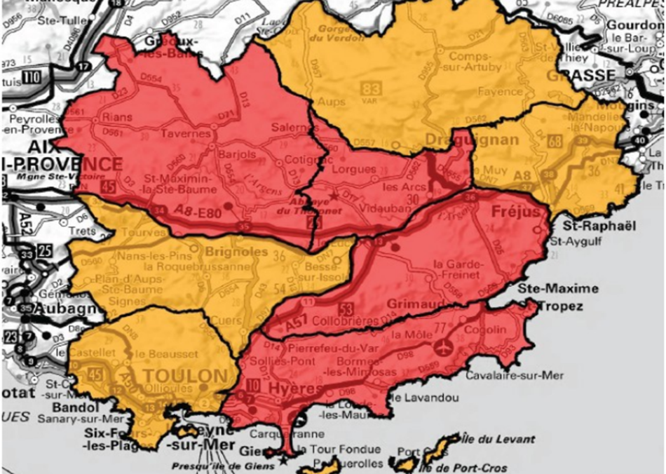 Les massifs des Îles d’Hyères, des Monts Toulonnais, de la Sainte-Baume, de l’Esterel et du Plateau de Canjuers sont en risque sévère. Leur accès est déconseillé et les travaux interdits