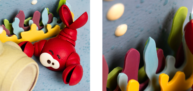 Une pièce unique et maîtresse de la collection de Pâques 2024. Nous avons imaginé un tableau de fonds marins, avec une faune et une flore colorées et craquantes et bien sûr le Chauvetilus, le sous-marin tout rond, tout doux et tellement chocolaté !