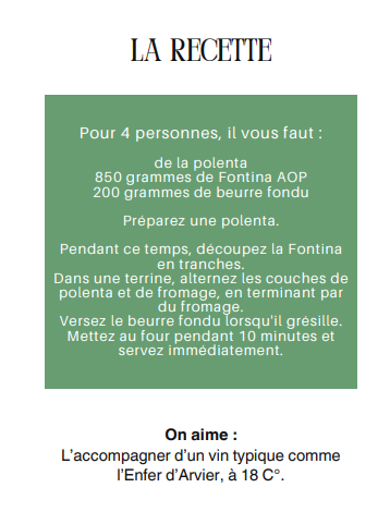 La spécialité : Dans la Vallée d’Aoste, la polenta se déguste aussi bien nature que « concia », c’est-à-dire avec beaucoup de beurre et de fromage, dont la fameuse Fontina.